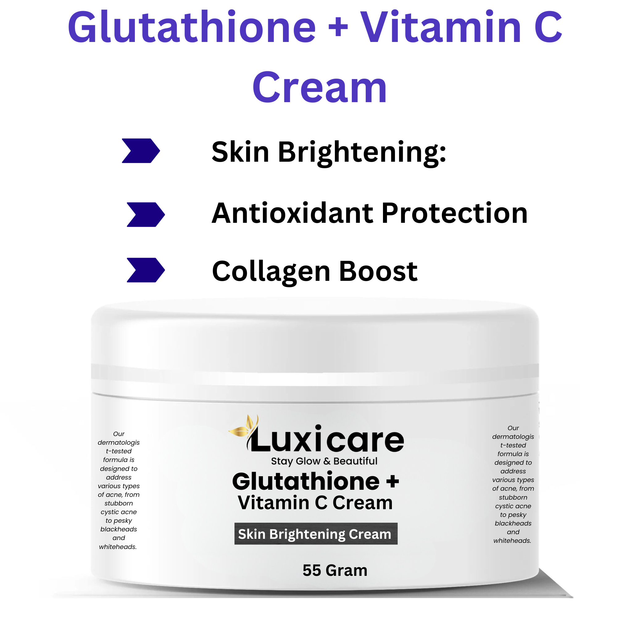 Wish for a lit-from-within glow? LUXICARE Glutathione + Vitamin C Cream makes it reality! This powerhouse blend of Glutathione, nature's most potent antioxidant, and stabilized Vitamin C is your skin's ultimate brightening.